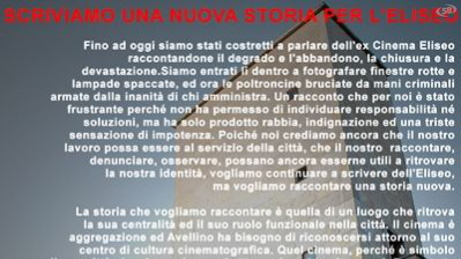 ''Fino ad oggi siamo stati costretti a parlare dell'ex Cinema Eliseo raccontandone il degrado e l'abbandono, la chiusura e la devastazione. Siamo entrati lì dentro a fotografare finestre rotte e lampade spaccate, ed ora le poltroncine bruciate da mani criminali armate dalla inanità di chi amministra. Un racconto che per noi è stato frustrante perché non ha permesso di individuare responsabilità né soluzioni, ma ha solo prodotto rabbia, indignazione ed una triste sensazione di impotenza. Poiché noi crediamo ancora che il nostro lavoro possa essere al servizio della città, che il nostro raccontare, denunciare, osservare, possano ancora esserne utili a ritrovare la nostra identità, vogliamo continuare a scrivere dell'Eliseo, ma vogliamo raccontare una storia nuova.