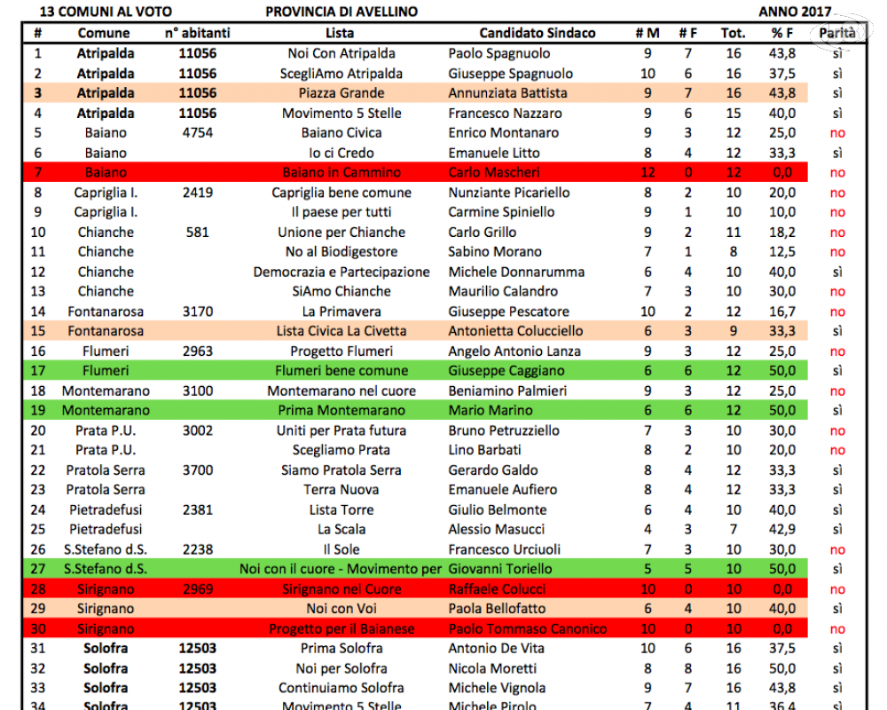 Sono 397 i candidati totali (esclusi i candidati sindaci), di cui 125 sono le candidate donne pari al 31,5% nelle complessive 34 liste presentate. «Solo 19 liste su 34 (circa il 56%) hanno una rappresentanza femminile adeguata», ricorda la Consigliera.La legge 215/12, approvata nel novembre del 2012, ha previsto per i comuni sopra i 5000 abitanti la preferenza di genere: l’elettore può esprimere fino a due preferenze (anziché una) a condizione che vadano a candidati di sesso diverso (pena l’annullamento della seconda scelta) e la quota di lista: nelle liste elettorali i candidati di uno stesso sesso non possono superare i due terzi del totale. Devono obbligatoriamente rispettare la parità di genere i Comuni con un numero di abitanti compresi tra i 5mila e 15mila. In questa competizione elettorale i due Comuni che superano i 5000 abitanti, Atripalda e Solofra, hanno rispettato nella composizione delle liste la rappresentanza di genere.