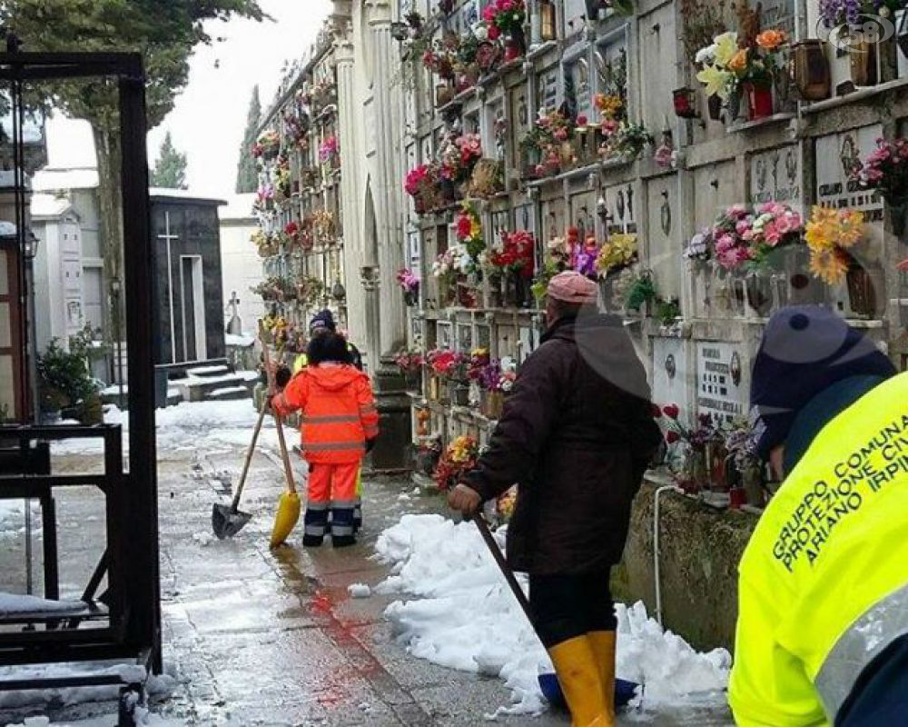 Ad Ariano Irpino, operai al lavoro per la sicurezza dei cittadini. Pulizia e messa in sicurezza del cimitero dopo la neve di domenica. Il gruppo comunale di Protezione Civile è tuttora all’opera per migliorare la viabilità nel territorio comunale e questa mattina ha provveduto, con la collaborazione di altro personale dell’ente, a rendere il camposanto fruibile, liberando il vialone d’ingresso e i vari accessi, oltre ai numerosi stradoni che conducono anche all’area di nuova costruzione del cimitero. Oltre a toglier via la neve che aveva ricoperto le stradine che conducono ai loculi, i volontari e gli operai hanno eliminato le formazioni di ghiaccio. Ciò nonostante, si richiede ai cittadini di prestare sempre attenzione.
