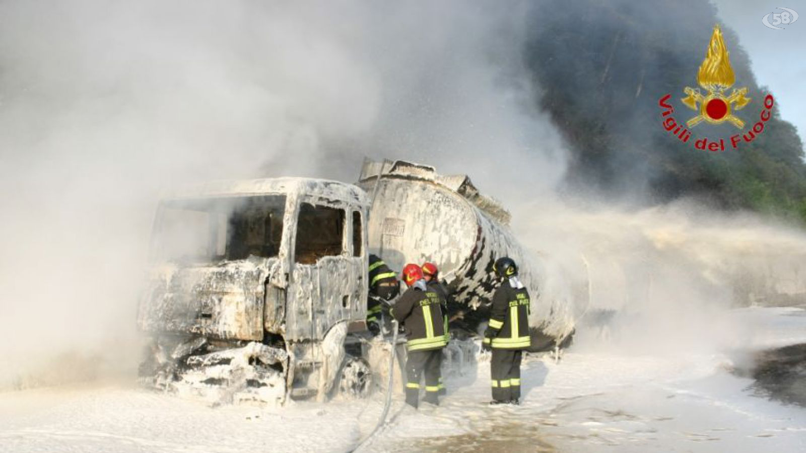 Lingue di fuoco altissime con continue esplosioni. Una cisterna che trasportava circa quarantamila litri tra gasolio e benzina, completamente avvolta dalle fiamme. Il conducente accortosi che vi erano del fuoco che fuoriusciva dal vano motore ha fatto appena in tempo ad abbandonare l'autotreno e a mettersi in salvo. Le immagini catturate dalla squadra dei Vigili del Fuoco di Avellino ben riescono a far vedere il disastro che si consumato lungo la Napoli-Bari tra Baiano e Monteforte. Intorno alle 07.00 di questa mattina, il centralino della sala operativa dei Vigili del Fuoco di contrada Quattrograne è stato subissato da richieste di soccorso per l’incendio, al chilometro 34, in direzione Canosa, poco prima della galleria di Monteforte Irpino. L'autostrada è rimasta stata bloccata in entrambi i sensi di marcia: il calore sprigionato dalla combustione del liquido infiammabile ha raggiunto anche centinaia di metri. Panico da parte degli automobilisti che hanno abbandonato le autovetture per spostarsi in luogo sicuro. Dieci in totale le squadre dei caschi rossi che sono dovute intervenire per evitare il peggio: quattro partite dalla centrale avellinese, quattro dal distaccamento di Montella e in supporto ne sono arrivate altre due squadre dal distaccamento di Nola, del comando di Napoli.