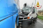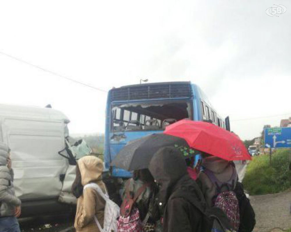 Pauroso incidente in Valle Ufita, fra Ariano e Melito all’altezza del ponte. Un furgone ha perso il controllo schiantandosi contro un pullman di linea pieno di studenti all’uscita di scuola. Momenti di assoluto panico, ma per fortuna non ci sono state gravissime conseguenze. L'autista del furgone è stato portato all'ospedale di Benevento mentre molti studenti, nel pomeriggio sono stati accompagnati dai genitori all'ospedale di Ariano, per farsi visitare dai medici del pronto soccorso. Sul posto sono accorsi i vigili del fuoco di Ariano e Grottaminarda per le operazioni di rimozione delle pesanti vetture. La strada è rimasta bloccata per ore. Sul luogo anche le ambulanze. Nell'impatto sarebbero rimasti feriti lievemente alcuni studenti.