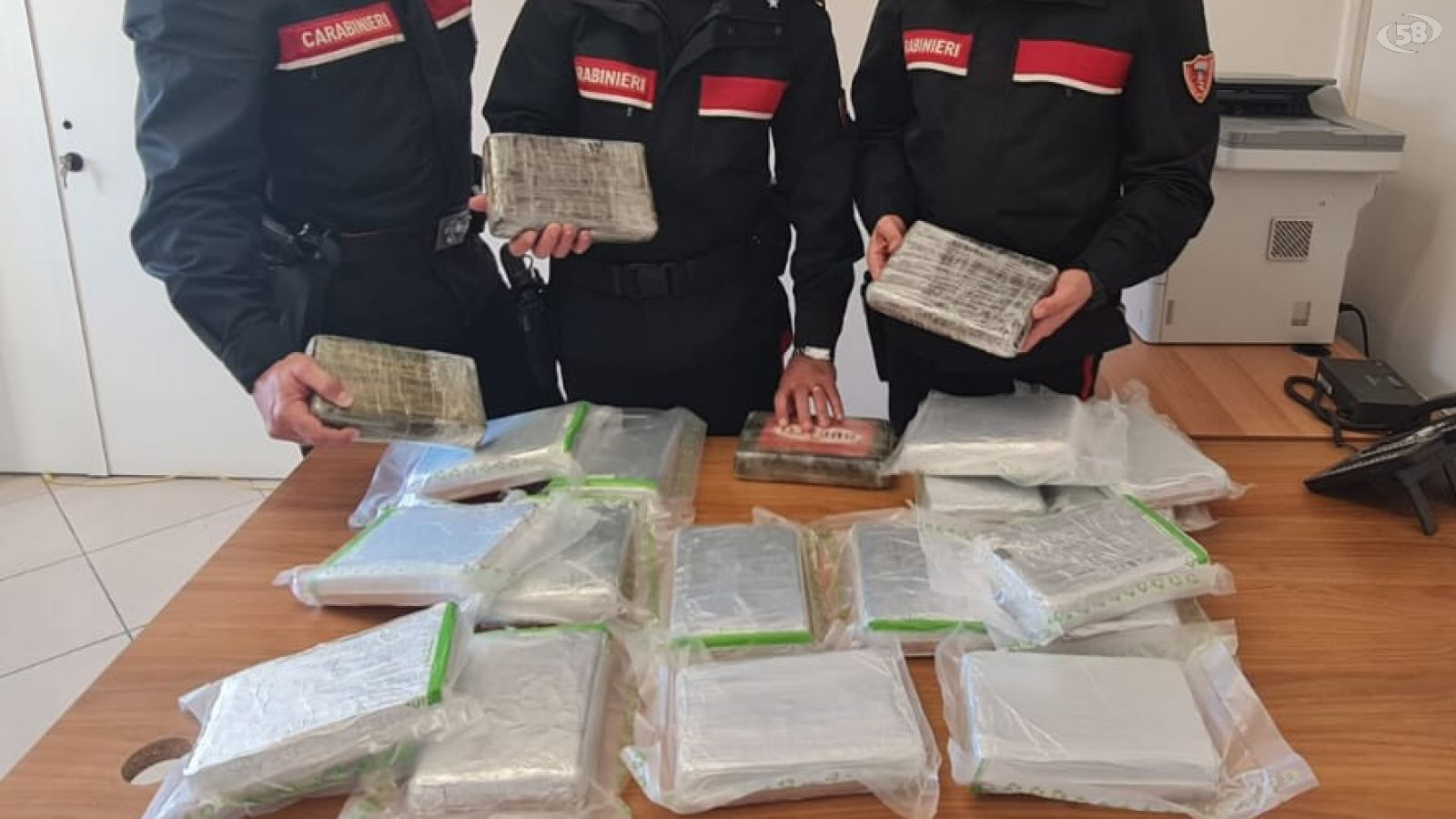 Incuriositi dal suo atteggiamento, i Carabinieri perquisiscono l’auto e nel portabagagli trovano 20 panetti sottovuoto di cocaina finissima.
