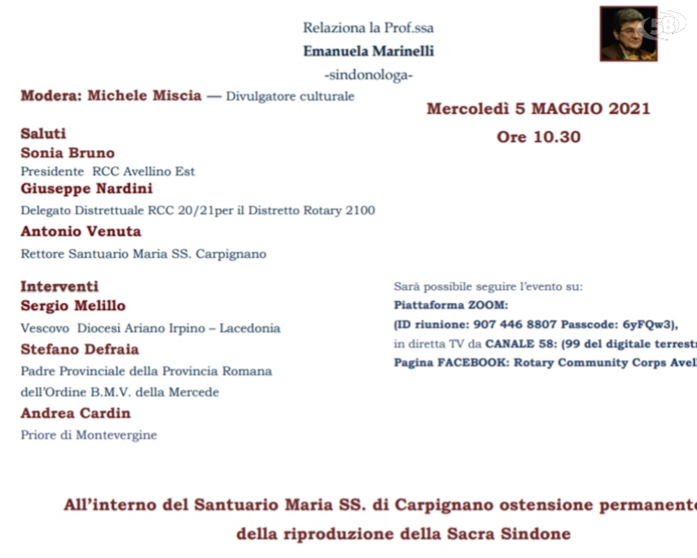 L’evento vedrà la partecipazione della Prof.ssa Emanuela Marinelli, esperta sindonologa di livello internazionale ed autrice di numerose pubblicazioni sull’argomento, di Mons. Sergio Melillo Vescovo della diocesi Ariano I.- Lacedonia, del Priore dell’Abazia di Montevergine Don Andrea Cardin e di Padre Stefano Defraia Padre Provinciale della Provincia Romana dell’Ordine di B.M.V. della Mercede, moderato dal Prof. Michele Miscia divulgatore culturale. Il Rotary Community Corps AV EST, promotore dell’evento, sta realizzando già da tempo progetti volti alla valorizzazione e alla conoscenza di opere d’arte ed oggetti sacri custoditi nelle più belle chiese d’Irpinia.