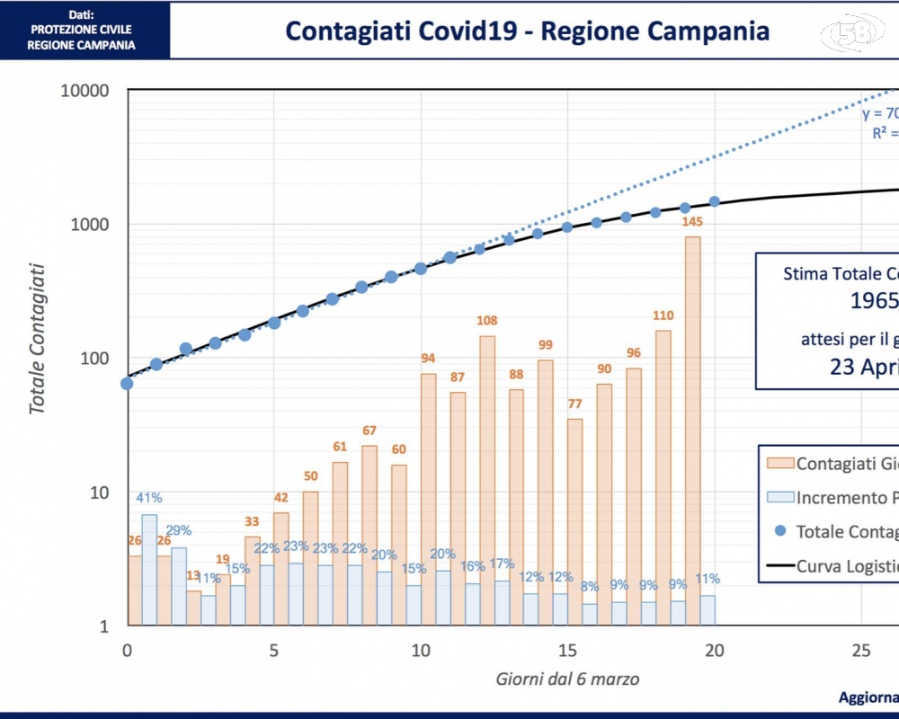 Anche se negli ultimi giorni si è avuto un incremento sensibile del numero di contagi in Campania (si vedano le barre arancioni nel grafico), con una conseguente sostanziale stagnazione dei valori dell'incremento percentuale di contagi (barre azzurre) - che invece sarebbe bene scendessero sempre! - il trend di crescita a medio termine ci consegna ancora BUONE SPERANZE di rimanere su una "curva logistica" (curva nera), avendo lasciato -si spera definitivamente- il trend di crescita esponenziale (linea tratteggiata blu - si noti che il grafico è in scala semilogaritmica). In definitiva, senza pretesa di verità, con tutte le precauzioni di un esercizio scientifico e in maniera del tutto ufficiosa, le mie stime consegnano un numero di contagi al plateau pari a circa 2000, attesi per il giorno 23 aprile (un po’ peggio delle stime dell’altro giorno, ma nello stesso ordine di grandezza).