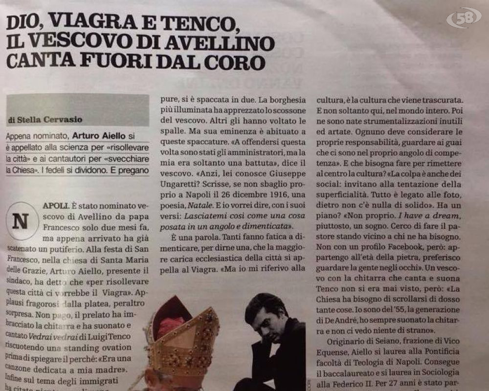 Mite, riservato, di poche parole. Poche, ma evidentemente efficaci e dirompenti, se persino una testata nazionale importante come Repubblica decide di dedicargli un'intera pagina del suo inserto settimanale, ''Il Venerdì''. Protagoista è il Vescovo di Avellino Monsignor Arturo Aiello, nominato da Papa Francesco all'inizio dell'estate. L'articolo, firmato da Stella Cervasio, porta il titolo ''Dio, Viagra e Tenco: Il Vescovo canta fuori dal coro''.