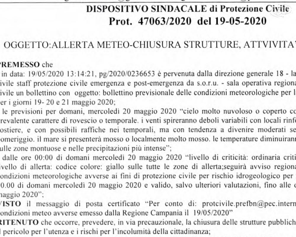 Allerta meteo: il sindaco di Benevento Clemente Mastella firma l'ordinanza nella quale dispone per la sola giornata di domani: "... la chiusura, precauzionale, ai visitatori del cimitero comunale; la chiusura dei parchi pubblici cittadini (villa comunale, giardini De Falco, area ponte Tibaldi e parco archeologicodell'Arco del Sacramento);