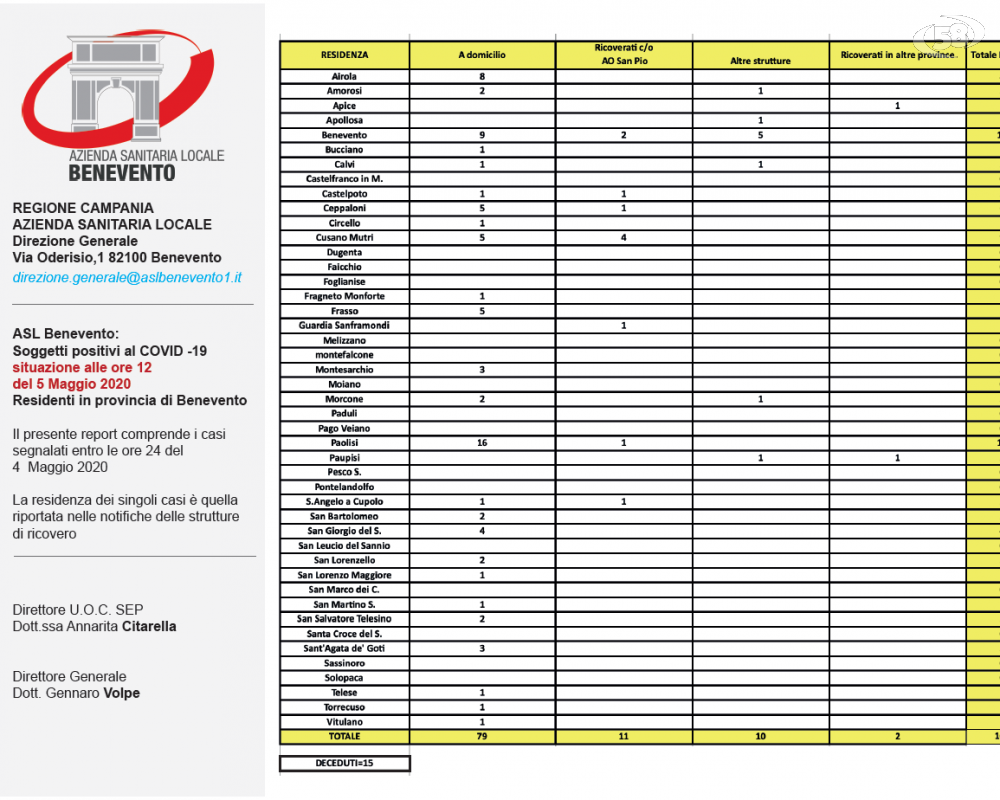 Il Bollettino dell'Asl di Benevento diramato poco fa fotografa una diminuzione di contagiati 102 e più guariti: 69.