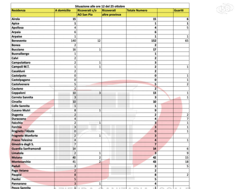 43 sono a Montesarchio a cui si sommano i 18 guariti – due sono ricoverati.