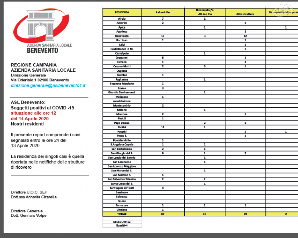 Nel Sannio si registra - come da Bollettino dell'Asl - solo un incremento: da 140 si passa a 141 per un totale complessivo di 157 casi (con 12 decessi e 4 guarigioni).