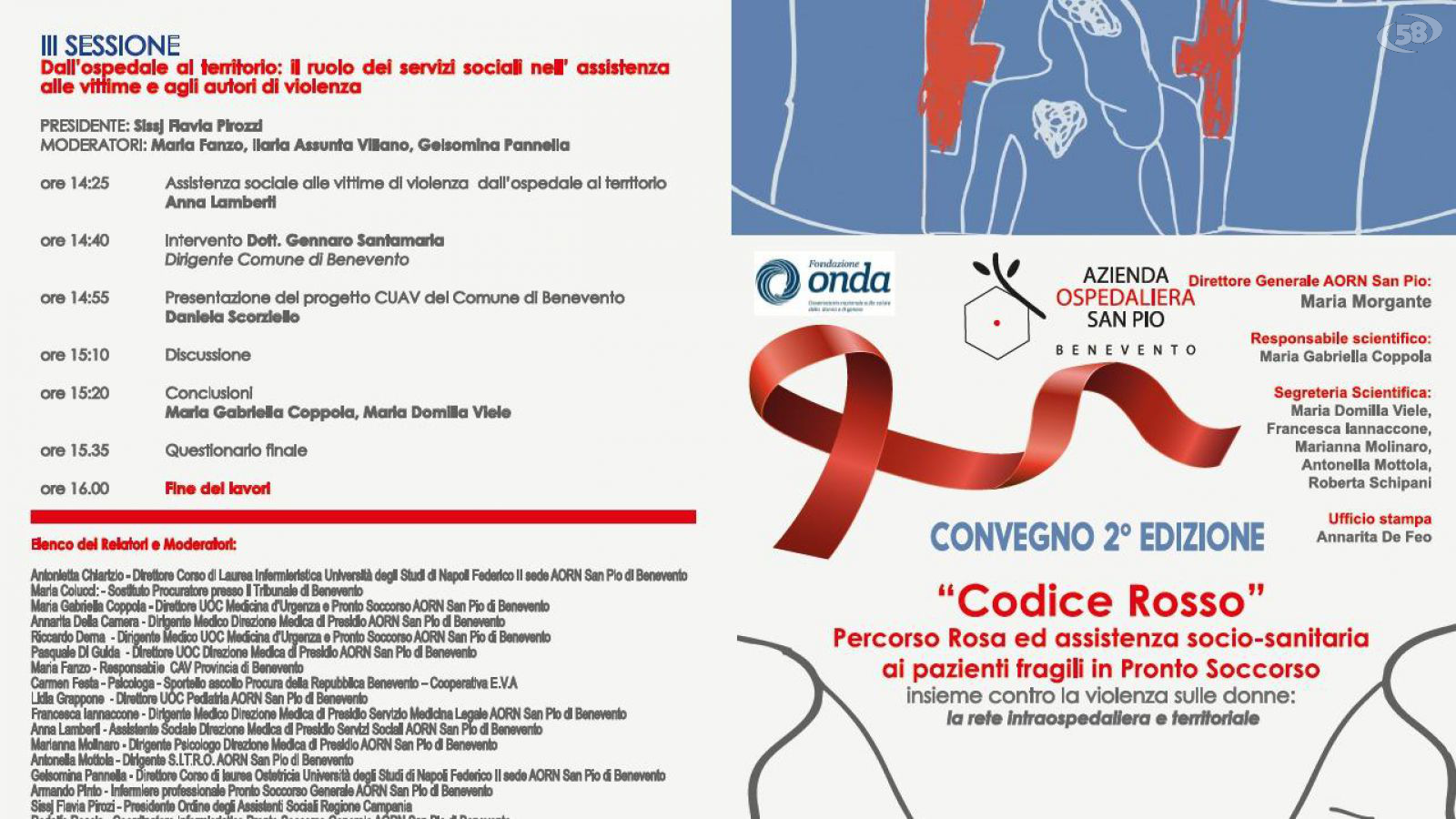 “ Codice Rosso: Percorso Rosa ed assistenza socio-sanitaria ai pazienti fragili in Pronto Soccorso” è questo il titolo del convegno organizzato presso la Sala Convegni del Padiglione Santa Maria delle Grazie dell’AORN SAN PIO di Benevento mercoledi 25 novembre alle ore 9.00.