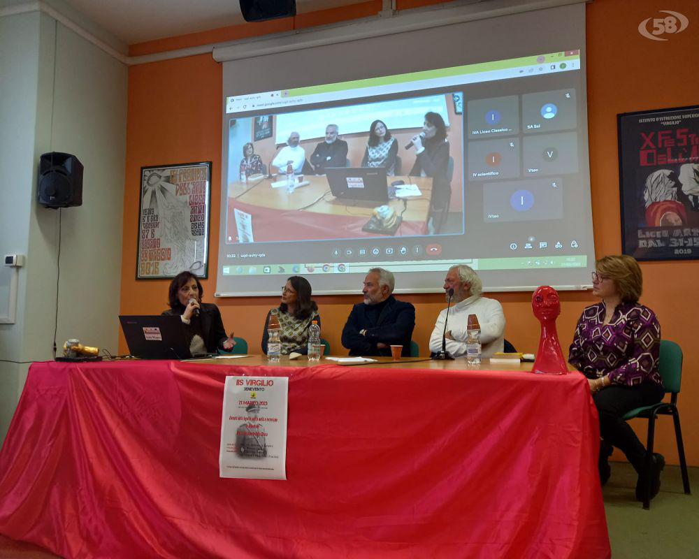 Ha moderato l’incontro la prof.ssa Anna Cavuoto, vista l’impossibilità a partecipare del prof. Mariano Goglia; presenti le classi quarte e quinte del “Virgilio”, quelle del Liceo Artistico in Aula Magna, quelle dei plessi di San Giorgio in collegamento streaming.