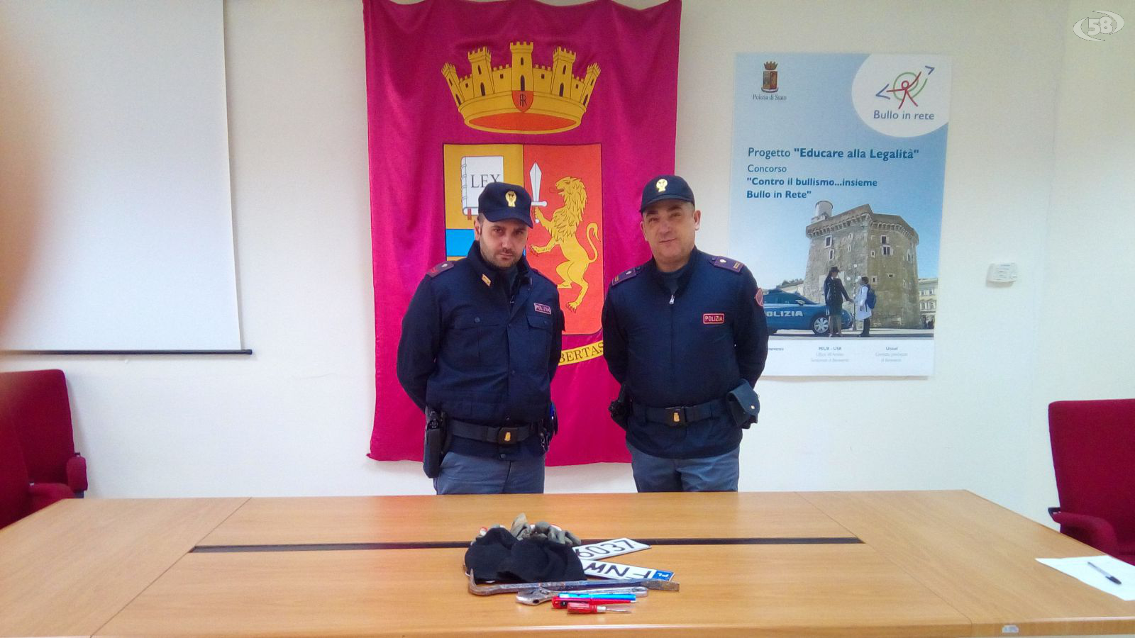 Erano intenzionati di sicuro a svaligiare abitazioni, i due cittadini romeni fermati nella tarda serata di sabato da una pattuglia della Squadra Volante, all’ingresso di Benevento.I due, entrambi pregiudicati, a bordo di un’autovettura con targa polacca con all’interno arnesi atti allo scasso, guanti e cappelli in lana destinati al travisamento, si stavano aggirando con fare sospetto tra le abitazioni, quando sono stati bloccati.Dagli accertamenti successivi è poi emerso che le targhe della vettura Audi A6 appartenevano ad altro veicolo e che l’intera documentazione associata al veicolo era stata riprodotta falsamente.Inoltre il conducente risultava non munito di patente di guida.I due, accompagnati in Questura, sono stati così denunciati per uso di atti falsi, possesso di arnesi atti allo scasso ed il guidatore anche sanzionato per mancanza del titolo abilitativo alla conduzione di veicoli.Nel corso di altra operazione gli uomini della Squadra Volante, al termine di una breve attività d’indagine effettuata dalla Squadra Mobile, hanno rintracciato due sedicenni che si erano allontanati dalle loro abitazioni nella giornata di venerdì, senza dare più alcuna notizia ai familiari.I ragazzi avevano trovato rifugio e trascorso la notte nei pressi dell’area del “Malies”, dove sono stati poi trovati, in buone condizioni di salute.