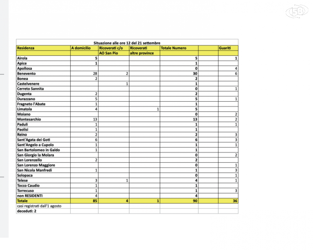 Il tutto in base al censimento aggiornato alle ore 12 di oggi dell'Asl di Benevento. (in basso nel riquadro il prospetto comune per comune)