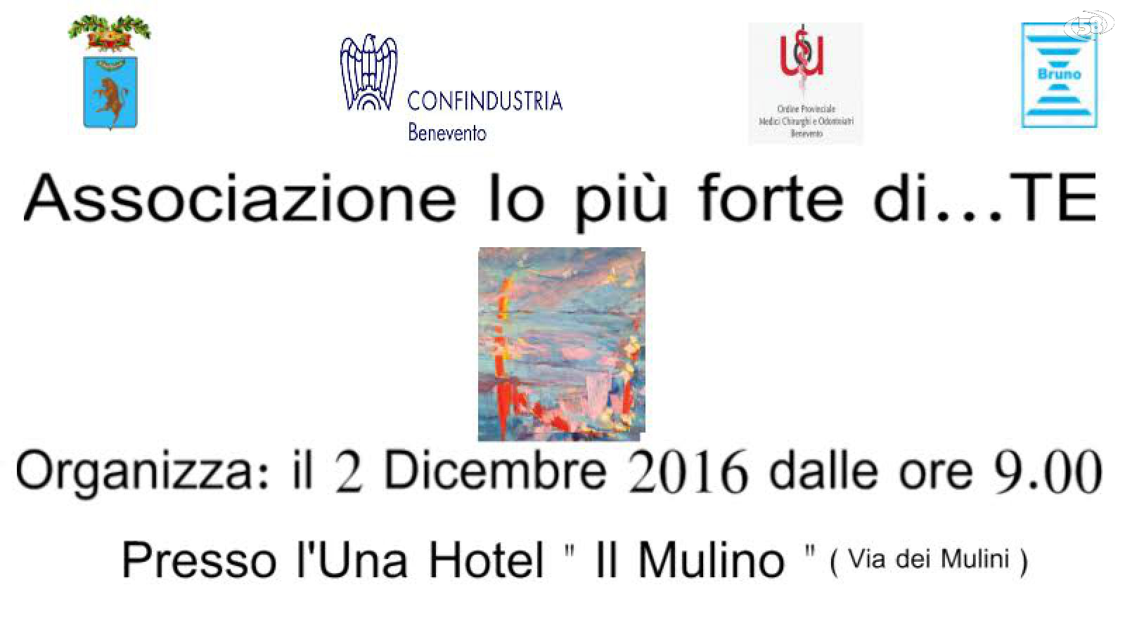 Combattere e prevenire il cancro si può: l'interessante e utile giornata di approfondimento si terrà venerdì 2 dicembre, a partire dalle ore 9.00, presso l’Una Hotel di Benevento, una giornata di approfondimento seminariale organizzata dall’Associazione “Io più forte di …TE” di Vittoria Principe, sui temi del recupero della donna affetta da patologie oncologiche.La giornata vedrà la presenza di specialisti del settore, non solo delle strutture sanitarie del territorio, ma anche di altre realtà, oltre i confini provinciali e regionali.L’iniziativa si avvale del patrocinio di Provincia di Benevento, ordine dei medici, ordine degli avvocati, Confindustria e della Casa farmaceutica Bruno SpA.