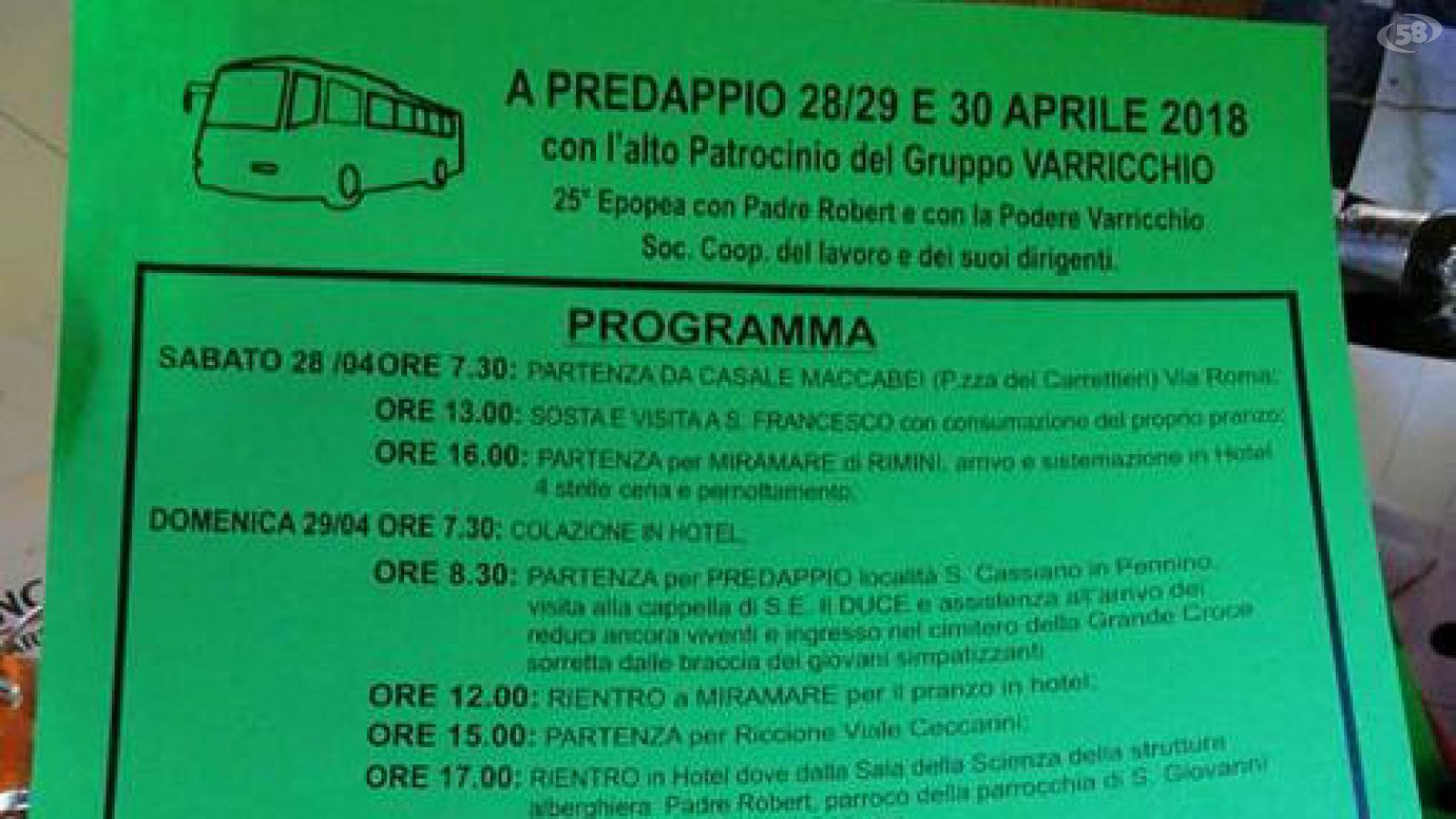 “Alcuni cittadini ci hanno fatto pervenire un volantino (che alleghiamo) nel quale leggiamo di una gita (29-30 aprile) che prevede anche la deposizione di fiori sulla tomba del Duce» e «assistenza ai reduci ancora vivi» (immaginiamo della Repubblica Sociale Italiana). A partecipare all’evento Padre Robert, «parroco della Parrocchia di San Giovani di Ceppaloni»”.