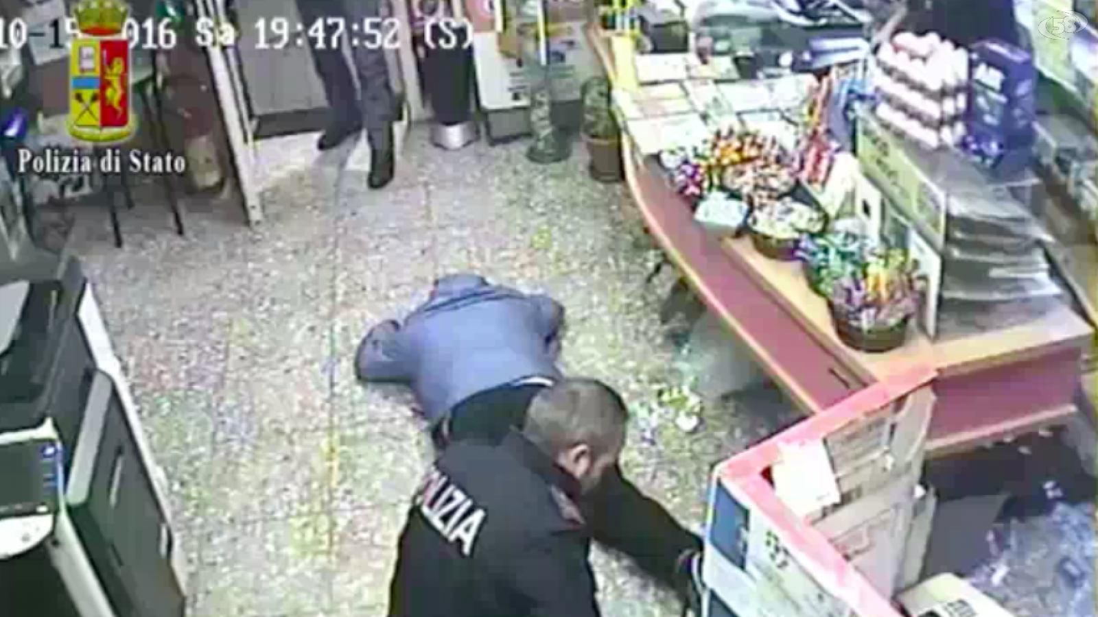 Le riprese delle telecamere di sorveglianza hanno registrato tutta la scena che dimostra la scaltrezza dei due rapinatori e la violenza che subisce il tabaccaio, nonché l'azione dei poliziotti che hanno immobilizzato e arrestato i due rapinatori, recuperando il bottino di oltre 3 mila euro.