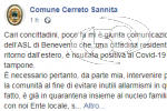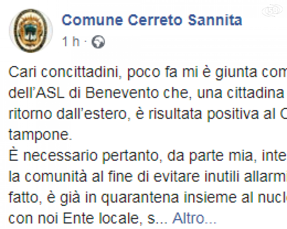"Cari concittadini, poco fa - scrive il primo cittadino - mi è giunta comunicazione ufficiale, da parte dell’Asl di Benevento che, una cittadina residente a Cerreto Sannita di ritorno dall’estero, è risultata positiva al Covid-19 dopo aver effettuato il tampone.