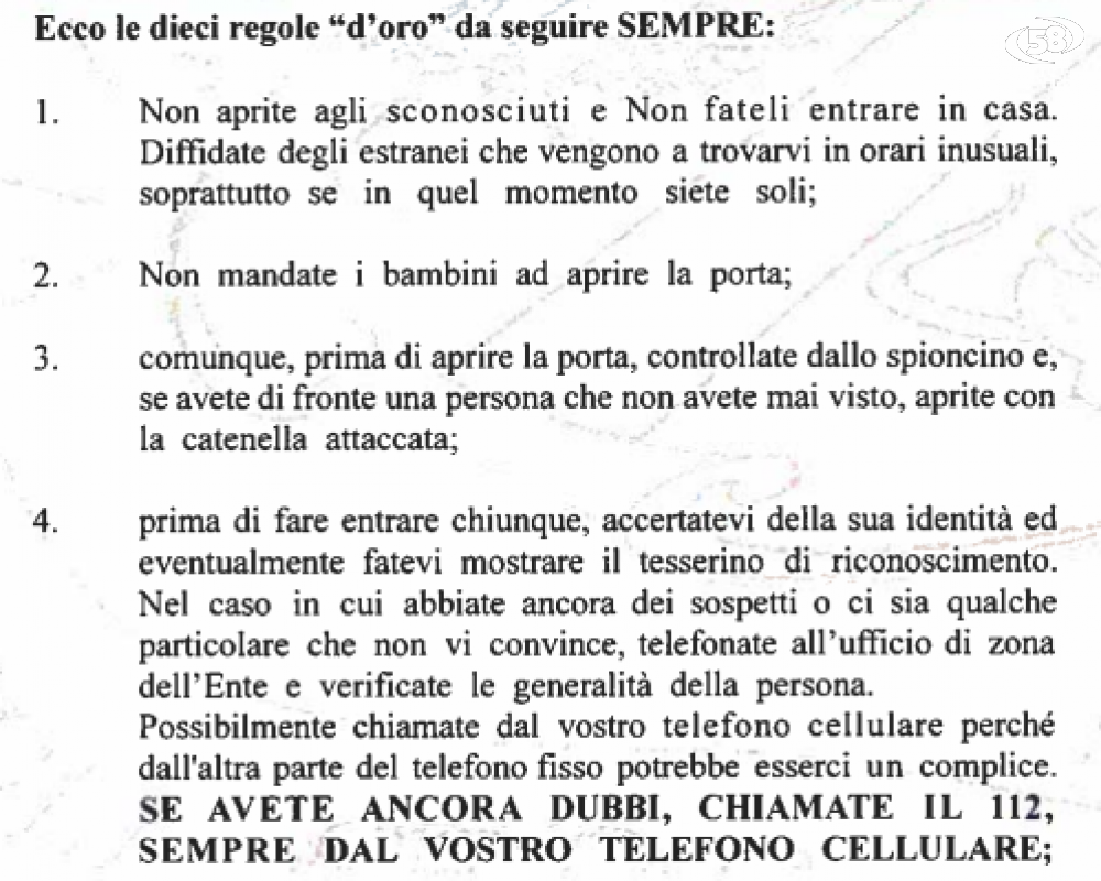 Nelle ultime settimane, nel territorio provinciale sannita si sono verificati alcuni episodi di truffa in danno di anziani, vittime preferite di criminali senza scrupoli, che, approfittando della buona fede di persone in tarda età, di cui spesso conoscono abitudini e notizie private, riescono con raggiri a farsi consegnare ingenti somme di denaro contante, sovente risparmi di mesi/anni di sacrifici.
