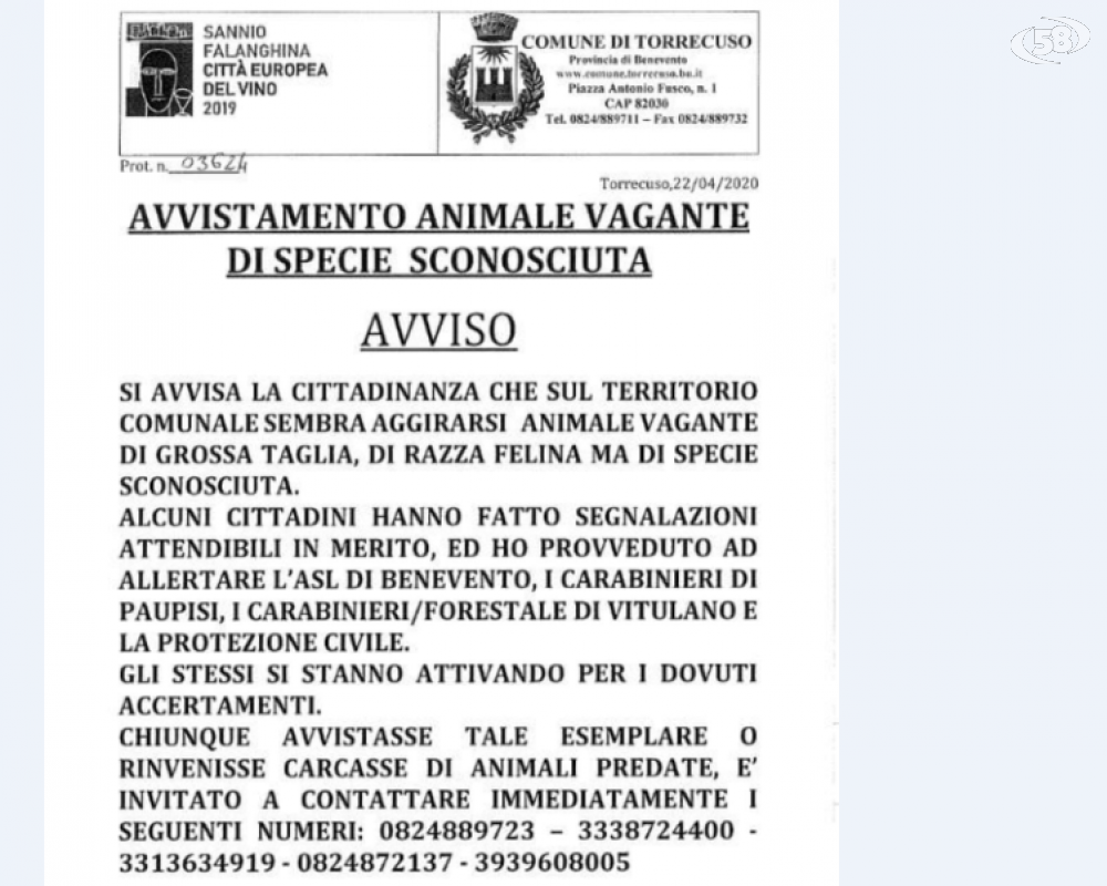Il 22 aprile l’avviso alla cittadinanza a firma del sindaco di Torrecuso Angelino Iannella dopo diverse segnalazioni che riferivano di un grosso felino di specie sconosciuta avvistato tra le campagne di Torrecuso: ieri l’amara scoperta. Sono state rinvenute le carcasse di un montone e una pecora. Entrambi sono stati sventrati.Il ritrovamento è avvenuto in località Contrada San Libero, meglio conosciuta come Staglio.