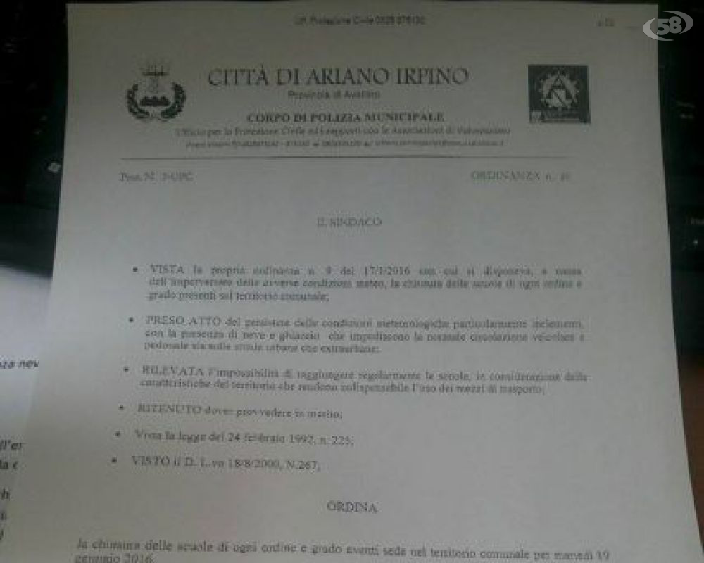 Un’altra Ordinanza, la n. 10 del 18 gennaio 2016, è stata emanata dal Sindaco, a seguito del persistere di ghiaccio e neve per le strade e dell’allerta meteo segnalata dalla Protezione Civile ancora per la giornata di oggi.