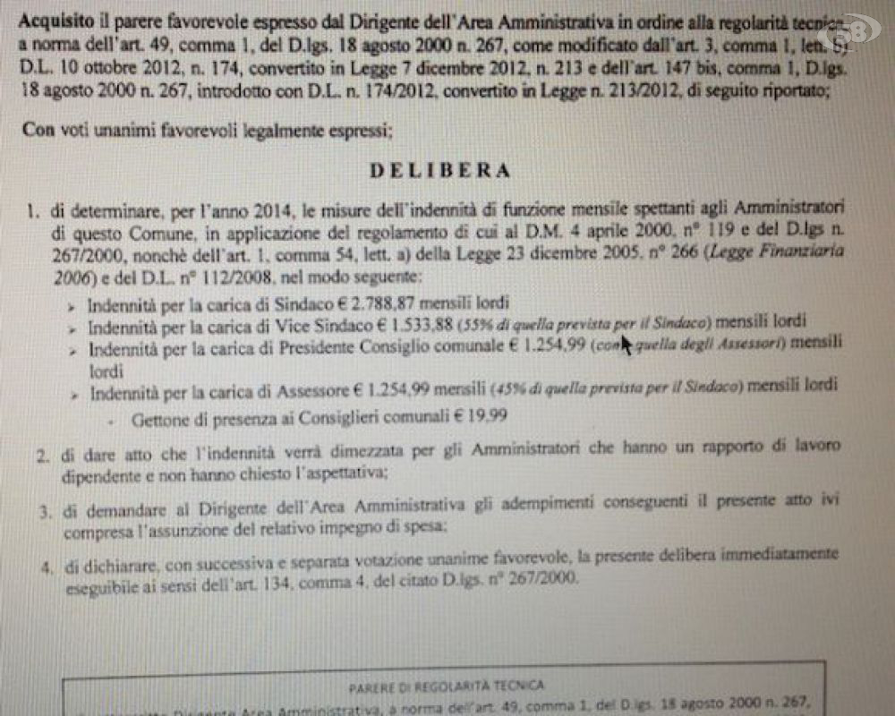 Una delibera della giunta del comune di Ariano fissa le indennità per l'anno 2014 di sindaco e assessori. Stabilito anche il gettone di presenza per i singoli consiglieri comunali. La delibera risale al 23 settembre scorso. Nella foto i compensi (lordi) per ogni singola carica. Per i dettagli della delibera clicca qui e vai su ''Determinazione indennita di funzione Amministratori comunali anno 2014''