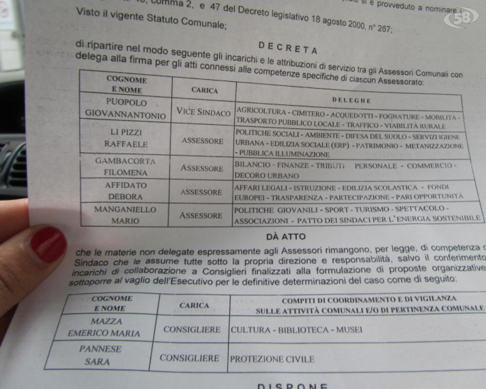 Il sindaco di Ariano Mimmo Gambacorta firma il decreto con gli incarichi e le attribuzioni di servizi alla squadra amministrativa: cinque gli assessori e due i consiglieri delegati. Si tratta di Emerico Maria Mazza, esponente di Forza Italia, che si occuperà della Cultura, Biblioteca e Musei, e il Nuovo Psi, con Sara Pannese, sarà delegato alla Protezione Civile. Il primo cittadino ha trattenuto a sé i Lavori Pubblici, l’Urbanistica, Polizia Municipale e Sviluppo Economico. L’ufficializzazione è arrivata durante la conferenza stampa a Palazzo di Città.