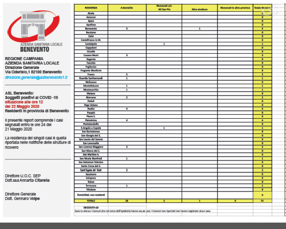 Sono le cifre censite dall'Asl di Benevento nel Bollettino che fotografa la situazione Comune per Comune fino alle ore 12.