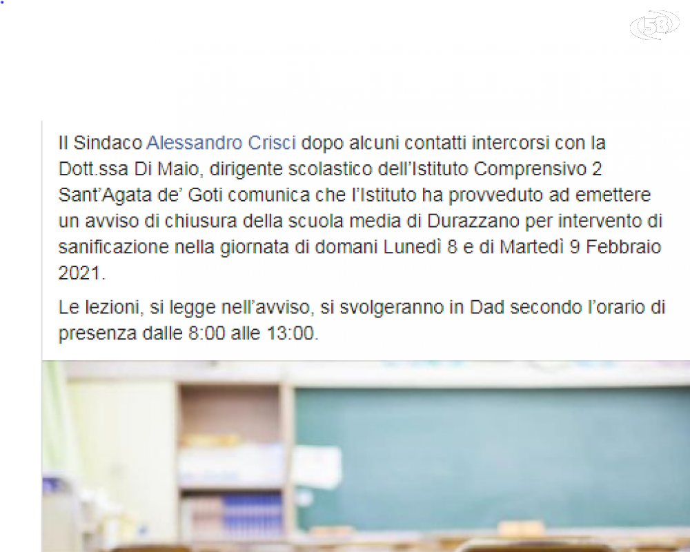 Resterà chiuso il plesso scolastico Istituto comprensivo 2 scuola media di Durazzano per interventi di sanificazione che saranno effettuati oggi e domani.
