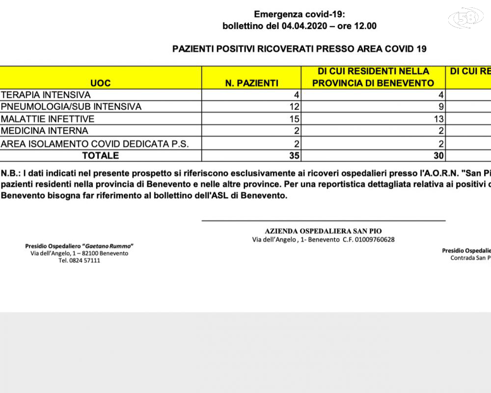 Come da Bollettino, puntuale, della direzione Ospedaliera San Pio, delle ore 12.00, si nota che da 37 di ieri i ricoveri chiaramente, purtroppo, sono scesi di due unità a causa dei due decessi.