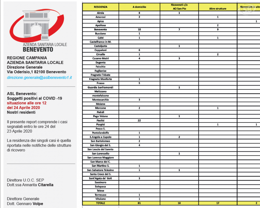 Intanto il dato complessivo, come da Bollettino Asl, dei Covid è di 175. 118 contagiati. 43 guariti e 14 deceduti
