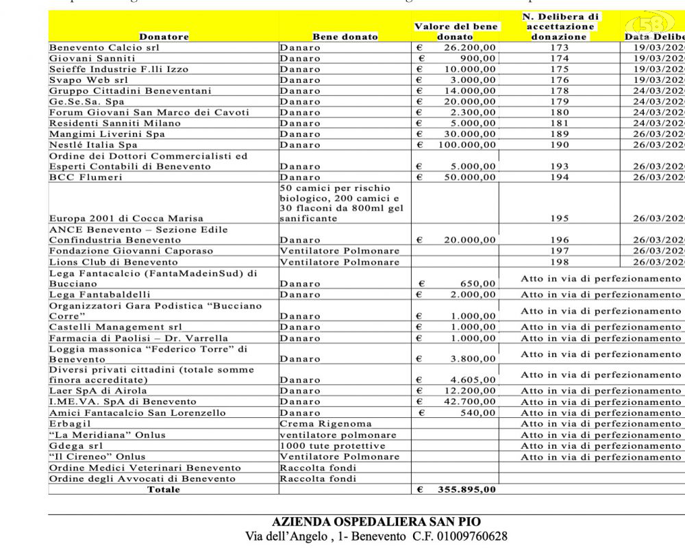 Il direttore generale, Mario Nicola Vittorio Ferrante, a nome dell’A.O.R.N. “San Pio” di Benevento, esprime la sua profonda gratitudine ai tanti cittadini, società ed enti, che, con generose donazioni, vanno supportando l’Azienda Ospedaliera per l’acquisto di dispositivi ed apparecchiature elettromedicali, che aiuteranno ad affrontare meglio la difficile situazione dovuta all’epidemia da covid-19.