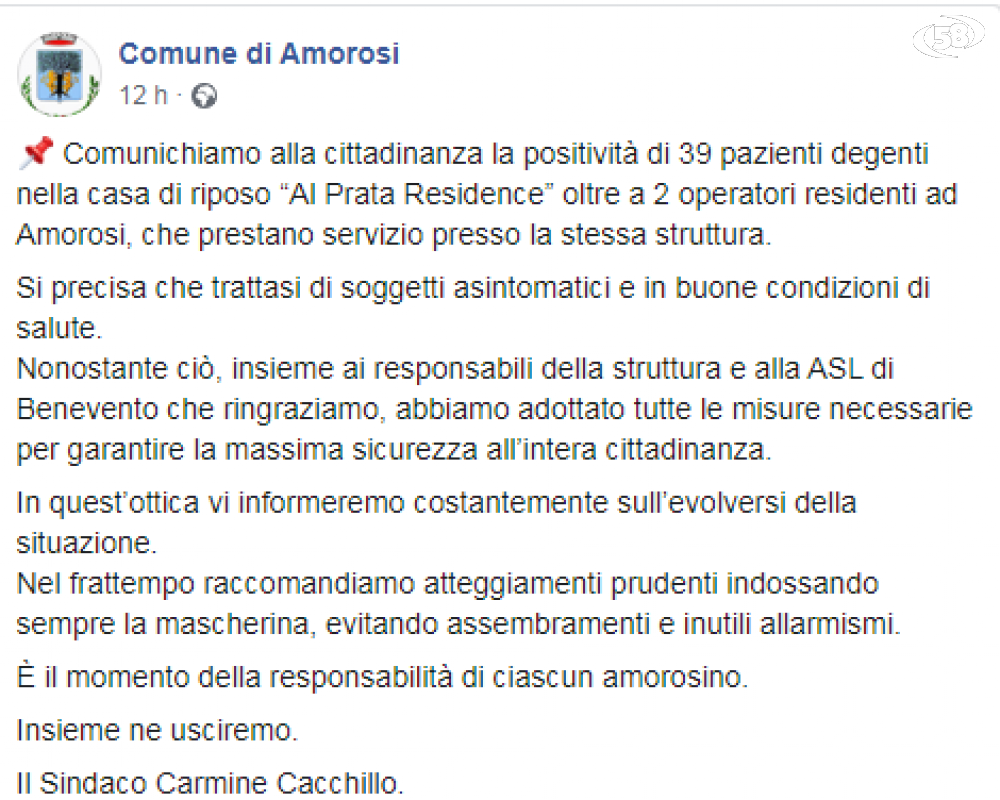 “Nonostante ciò, insieme ai responsabili della struttura e alla Asl di Benevento che ringraziamo, abbiamo adottato tutte le misure necessarie per garantire la massima sicurezza all’intera cittadinanza".