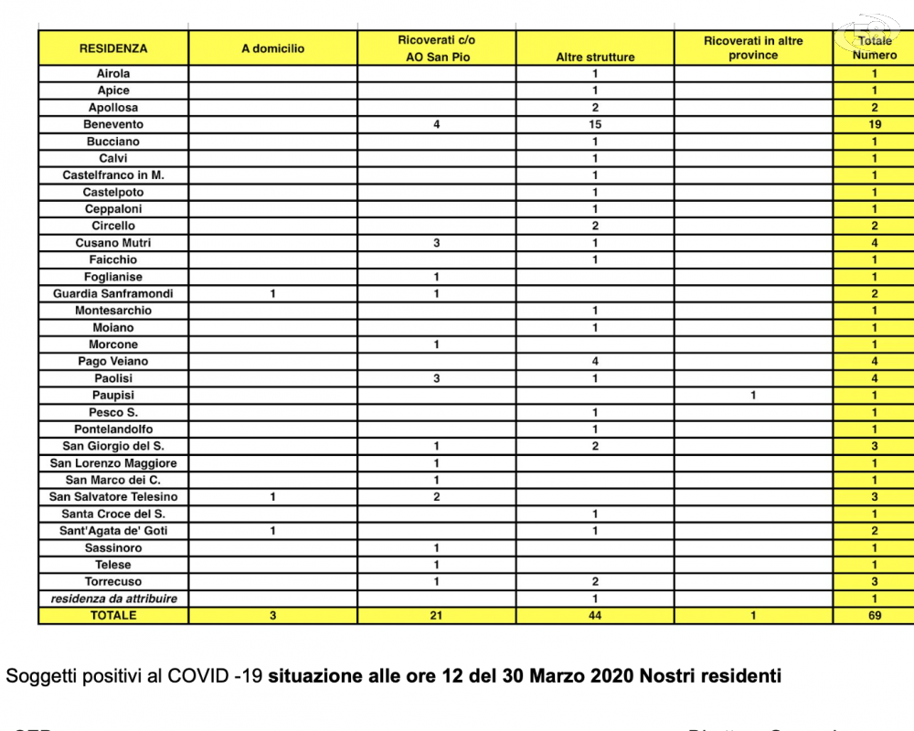Nella foto la tabella dettagliata dei casi, Comune per Comune.