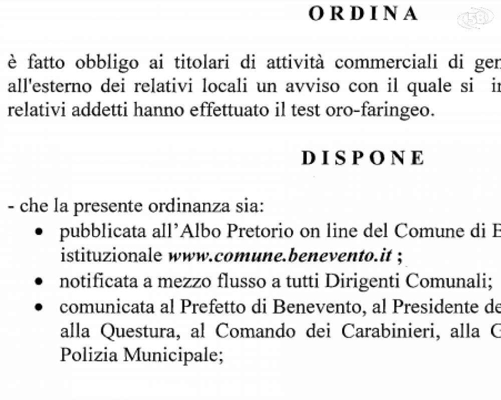 "E’ fatto obbligo ai titolari di attività commerciali di generi alimentari di esporre all’esterno dei relativi locali un avviso con il quale si informa la clientela che i relativi addetti hanno effettuato il test oro-faringeo per l’individuazione delle persone eventualmente positive al Covid-19".