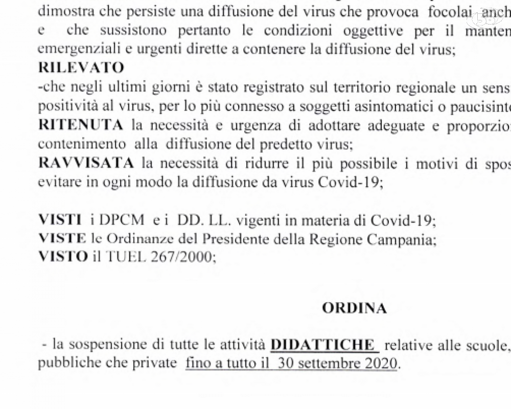 Nel provvedimento si ordina "... la sospensione di tutte le attività didattiche relative alle scuole, di ogni ordine e grado, sia pubbliche che private fino a tutto il 30 settembre 2020".