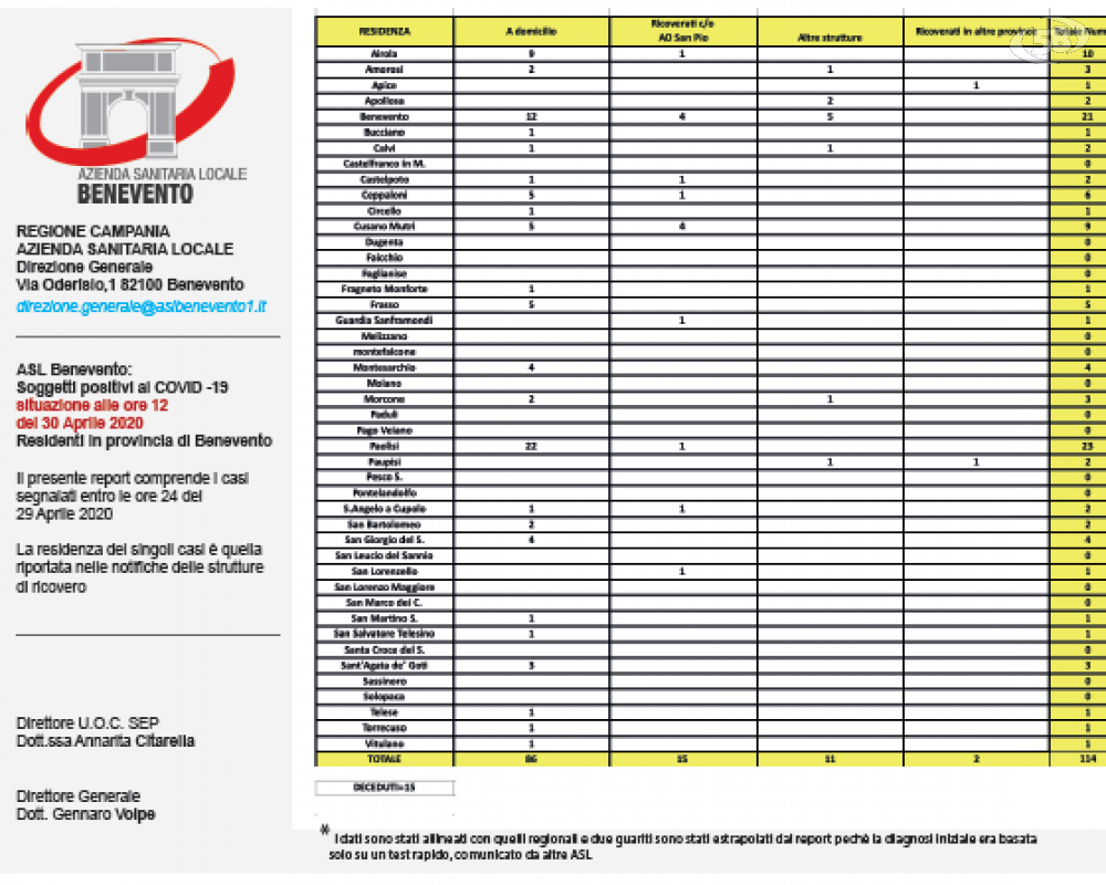 Stabile il dato nel Sannio: 114 contagiati e 53 guariti.