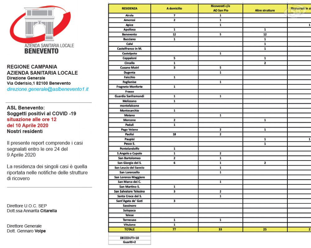 A questi si aggiungono i risultati dell’A.O.R.N. “San Pio” che ha processato 56 tamponi, dei quali 10 sono risultati positivi.